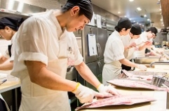 「ホール」「仕込み・握り」「シャリ部」「巻物・軍艦」など部門に分かれており、ローテーションを組んで仕事を身につけていきます。未経験の方なら、1年ですべての部門を経験し担当できるよう進めていきます。 |